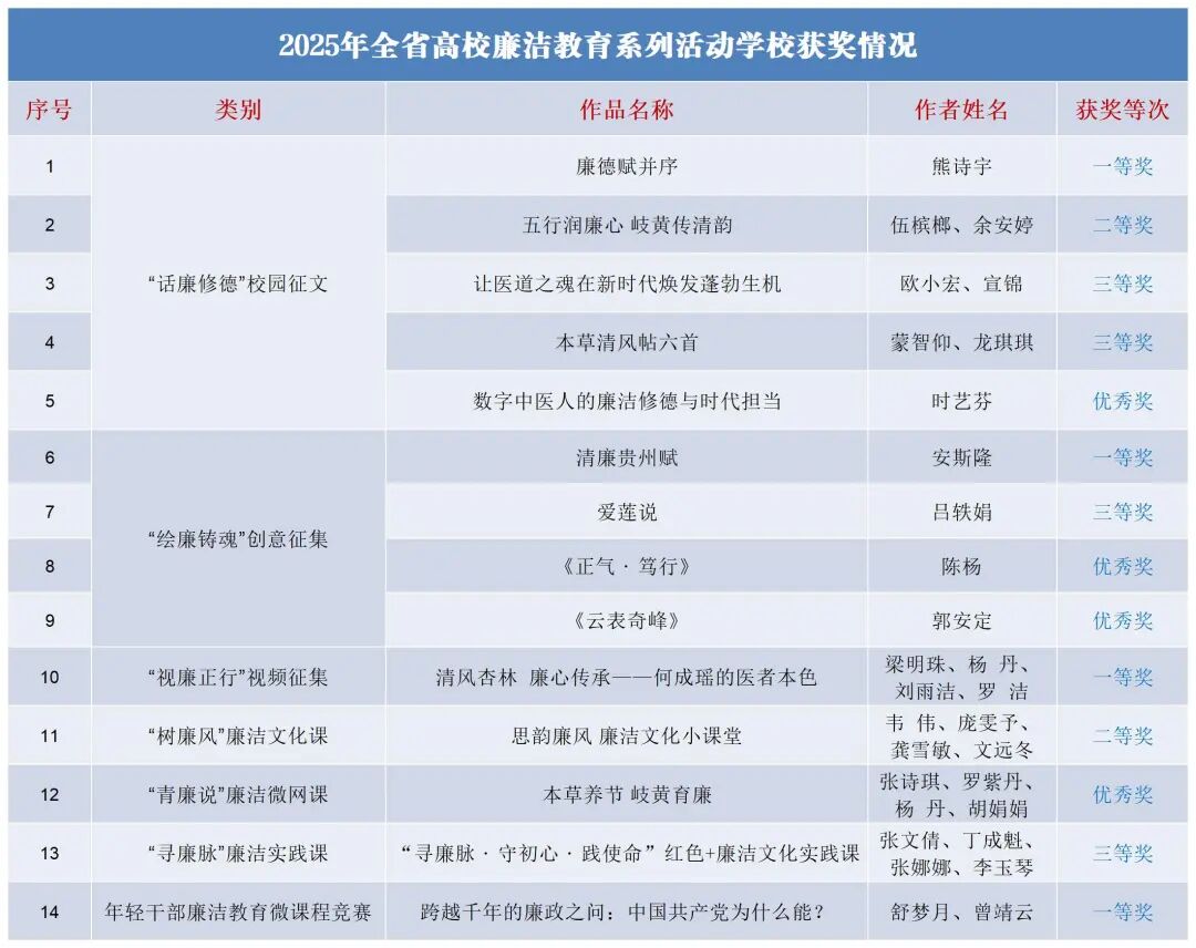 近日,贵州省教育厅公布2025年全省高校廉洁教育系列活动获奖结果名单。学校师生荣获多项佳绩,其中一等奖4项、二等奖2项、三等奖4项、优秀奖4项,奖项涵盖“话廉修德”校园征文、“绘廉铸魂”创意征集、“视廉正行”视频征集、“树廉风”廉洁文化课、年轻干部廉洁教育微课程竞赛等类别,充分展现了我校在清廉校园建设方面的丰硕成果。